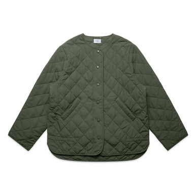Showcasing the AS Colour Women's Quilted Jacket, featuring 100% recycled polyester wadding. Features a collareless design, snap dome closure, and two side pockets. Made sustainably, saving approximately 89 recycled 500ml plastic bottles from landfill. Saving approx. 89 500ml plastic bottles from landfill. Printing Techniques: Suited for embroidery and applique Click here for more info Fabric Weight: Composition: Mid weight, 100% recycled polyester quilted lining & 100% recycled polyester wadding Product Weight: Midweight Fit: Relaxed Gender: Women. Colours: BACK, BLACK, BLACK - BACK, BONE, BONE - BACK, CYPRESS, CYPRESS - BACK, FRONT, MAIN, SIDE, TURN